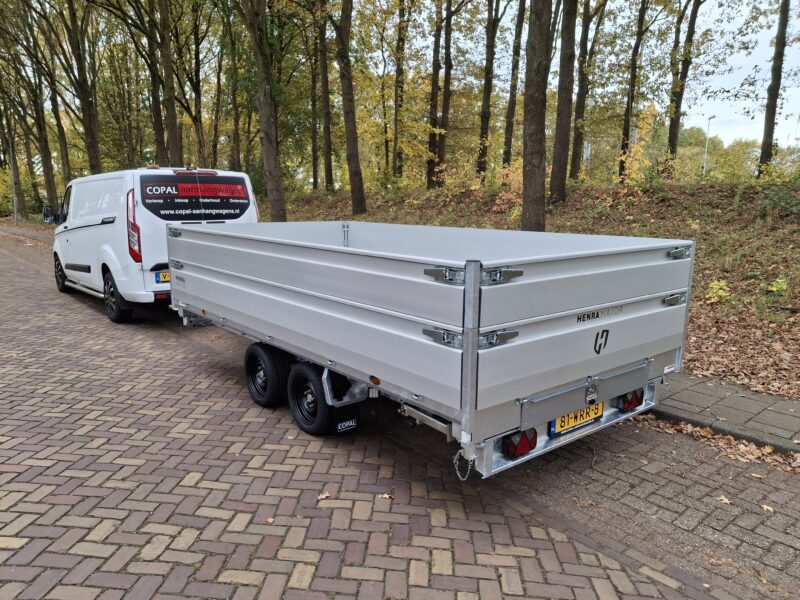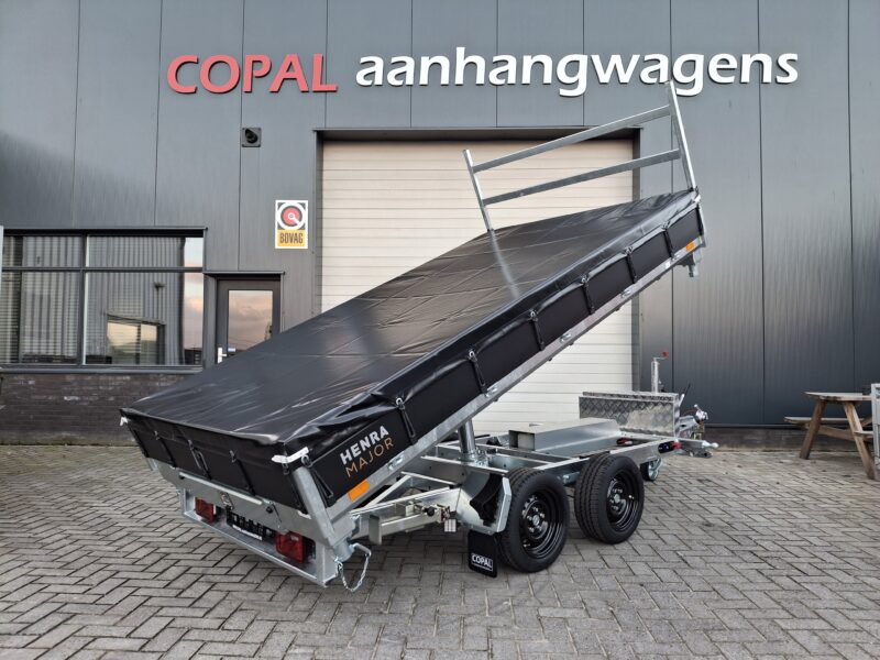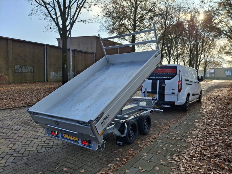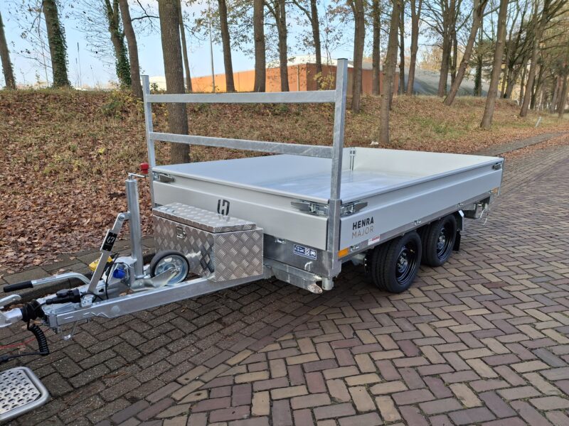 Het Henra-assortiment bestaat uit 3-zijdige kippers met elektrische bediening. Deze kippers zijn verkrijgbaar in diverse afmetingen, van minimaal 301x185cm tot maximaal 401x202cm. Alle modellen zijn leverbaar in dubbelas-uitvoering, waarbij gekozen kan worden tussen robuuste torsie-assen of paraboolgeveerde assen voor extra stabiliteit. Het grootste model, met afmeting 401x202cm, is bovendien verkrijgbaar als tridemas-uitvoering. Dit tridemas-model is standaard voorzien van 3x 1800kg-assen.